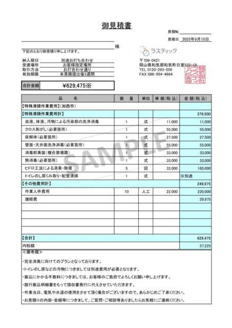 上の画像のように、作業前にどんな作業をするのか、その作業にいくらかかるのかを明確にお見積りとして提示させていただきます。特殊清掃の事例も豊富にあり、即日対応や遠方からのご依頼も可能です。