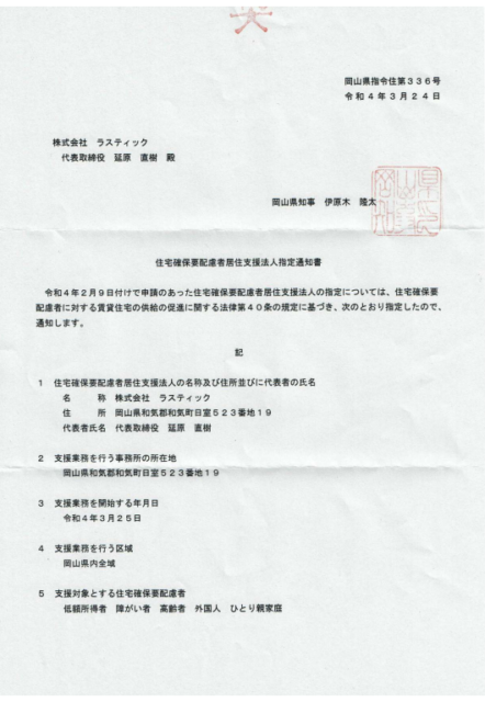 当社も玉野市を含む岡山県居住支援法人の一社として岡山県より認可を受け生活困窮者の遺品整理を対応。